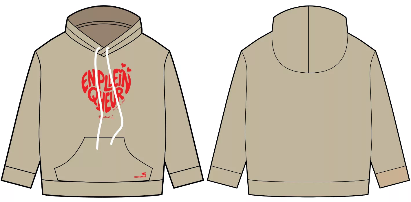 Coupe droite, poche kangourou, lien de serrage en coton au niveau du col, manches montées, bord côtes au col, en bas et au bas des manches, intérieur molleton brossé.