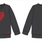 Coupe droite, col légèrement bateau, manches montées, bord côtes au col, en bas et au bas des manches, intérieur molleton brossé.