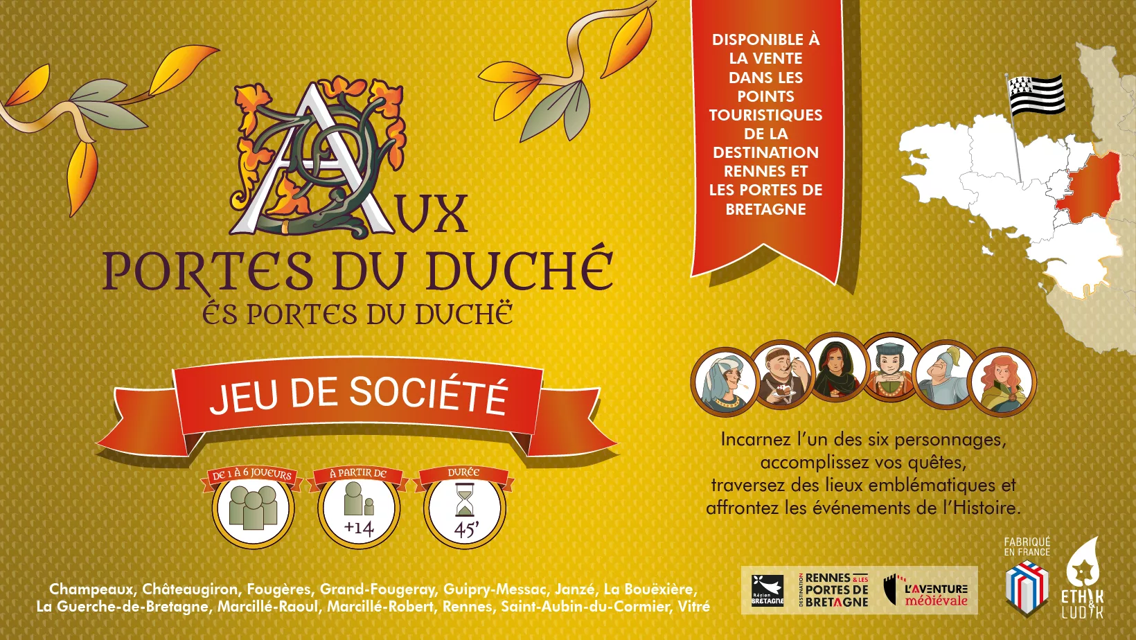 Unique en son genre, ce jeu « Aux Portes du Duché » plonge les joueurs au XVe siècle, lorsque le Duché de Bretagne vacille face au royaume de France. Incarnez l’un des six personnages pour accomplir des quêtes, traverser 13 lieux patrimoniaux emblématiques de la Destination Rennes les Portes de Bretagne et affronter les événements de l’Histoire. Le tout mise en coupe d’une mécanique stratégique : explorer et avancer… avant que l’histoire ne vous rattrape !